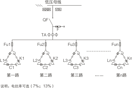 低壓TSC動(dòng)態(tài)無功補(bǔ)償裝置采用人工智能控制,由控制器、雙向可控硅、電容器、電抗器、保護(hù)元件等組成。控制器實(shí)時(shí)跟蹤測(cè)量負(fù)荷的功率因數(shù)和無功電流,與預(yù)先設(shè)定的給定值進(jìn)線比較,動(dòng)態(tài)控制電容器組的投切,以保證功率因數(shù)達(dá)到設(shè)定值。整個(gè)測(cè)量執(zhí)行過程在一個(gè)周波內(nèi)完成(時(shí)間<20ms),并實(shí)現(xiàn)可控硅過零觸發(fā),確保投切電容器無沖擊、無涌流、無過渡過程