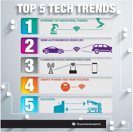 在迎接2015到來之際,我們有必要花時間來評估和預測未來的一年中將會出現(xiàn)的技術(shù)挑戰(zhàn)和突破創(chuàng)新。通過與眾多戰(zhàn)略客戶、大學合作伙伴以及TI產(chǎn)品線的技術(shù)專家進行探討后,我們認為TI將在一些重要技術(shù)趨勢中發(fā)揮戰(zhàn)略性作用。這些技術(shù)趨勢正推動著汽車和工業(yè)等多個市場的發(fā)展,而在此過程中,TI的工程師將幫助應對半導體技術(shù)領(lǐng)域的獨特挑戰(zhàn),并利用先進技術(shù)改善我們的生活。